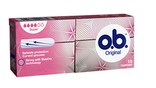 o.b.®-tampongernas vridna kanaler är utformade för att samla upp mensen inuti tampongen och ge dig ett pålitligt skydd. o.b.® Original Super rekommenderas för dig som har måttlig till kraftig blödning.