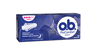 Testa o.b.® ProComfort™ Night med SilkTouch™-vingar som ger extra skydd mot läckage och är bekväm att föra in och ta ut.